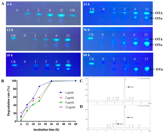 (A) Degradation of OTA by B. naejangsanensis ML17 at different OTA concentrations detected by thin-layer chromatography (TLC); (B) OTA degradation rate detected by HPLC; (C) HPLC profile of OTA; (D) HPLC profile showing the OTA-degrading activity of ML17. 0, 1, 2, 6, and 12 represent B. naejangsanensis ML17 treated with 0, 1, 2, 6, and 12 μg/mL OTA, respectively; CK indicates only OTA.