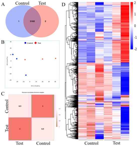 Gene expression in B. naejangsanensis ML17. (A) Venn diagram of gene expression changes between control and test. (B) Control and test group gene expression PCA analysis. (C) Gene expression in control and test groups by Pearson correlation analysis. (D) Cluster heatmap analysis of gene expression levels between the control and test groups. Control, without OTA; Test, under 1 μg/mL OTA stress.