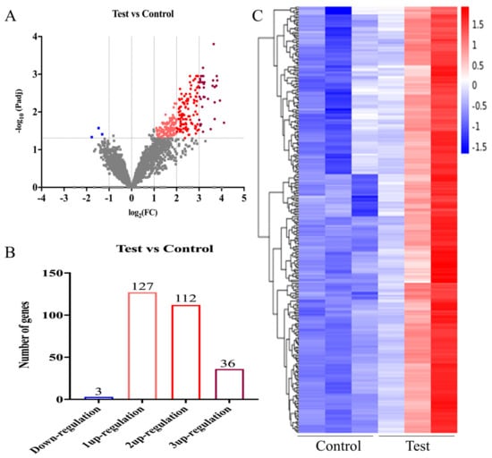 Effect of OTA exposure on gene expression in B. naejangsanensis ML17. (A) Volcano plot analysis of differentially expressed genes between the control and test groups; Gray: no significant difference in gene expression; blue: significant decrease in gene expression, rose: 3up-regulation in gene expression; red: 2up-regulation in gene expression; pink: 1up-regulation in gene expression. (B) Number of differentially expressed genes between the control and test groups. (C) Cluster heatmap analysis of differentially expressed genes between the control and test groups. Control, without OTA; Test: under 1 μg/mL OTA stress.