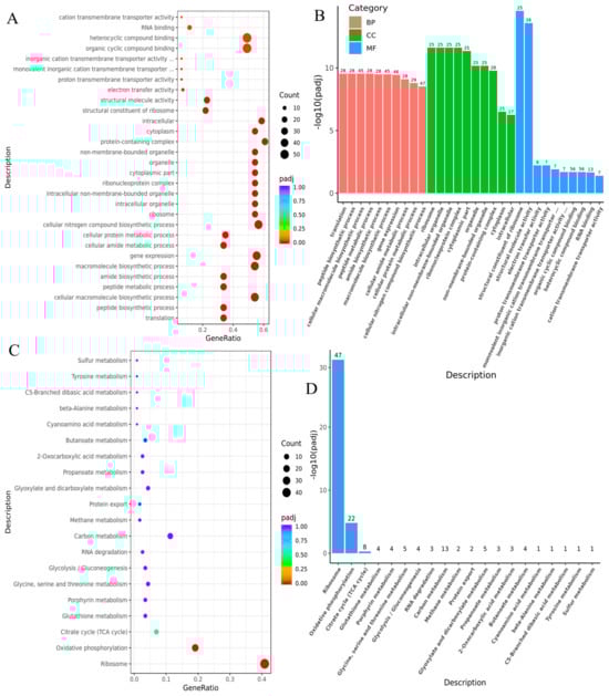 Functional analysis of differentially expressed genes in B. naejangsanensis ML17 between the control and test groups. (A) Gene ontology (GO) enrichment dot bubble plot of differentially expressed genes. (B) GO enrichment terms of differentially expressed genes. (C) Kyoto Encyclopedia of Genes and Genomes (KEGG) enrichment dot bubble plot of differentially expressed genes. (D) KEGG enrichment terms of differentially expressed genes.