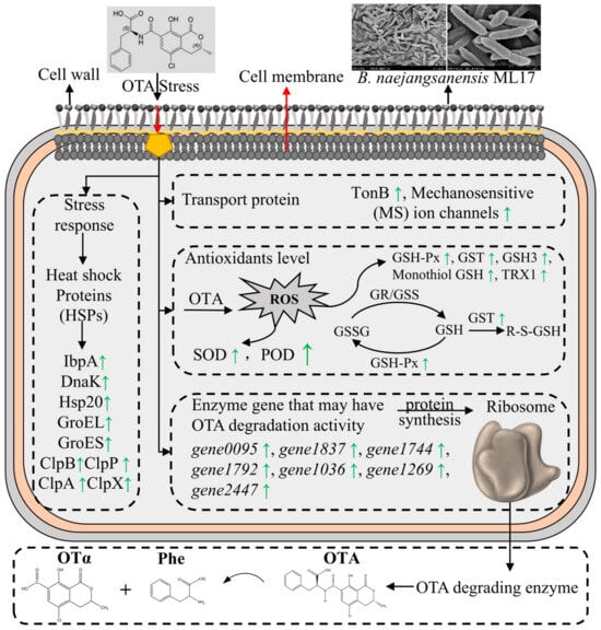 Combining the results of previous studies, the transcriptomic analysis of B. naejangsanensis ML17 under OTA stress, and the OTA degradation effect of its stress enzymes, we speculate that the degradation of OTA by B. naejangsanensis ML17 is the result of the joint action of multiple factors (Figure 6). In the presence of OTA, B. naejangsanensis ML17 rapidly upregulated oxidative stress-related pathway genes to resist the toxic effects of OTA. This made the effect on the growth of B. naejangsanensis ML17 insignificant in the presence of lower concentrations of OTA. However, when the toxin concentration was too high, the toxic effect of OTA on the strain was enhanced, resulting in the slow growth of B. naejangsanensis ML17 and increased morphological abnormalities in the organism. At the same time, B. naejangsanensis ML17 upregulated the expression of an OTA-degrading enzyme to degrade OTA into non-toxic OTα, thereby reducing the toxic effect of OTA on itself.