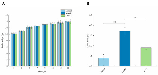GRP did not affect body weight in alcohol-induced mice but decreased alcohol-induced organ index: (A) representative weights; (B) organ index. The results are expressed as the mean ± SD (n = 6–8). * p < 0.05 and ** p < 0.01.