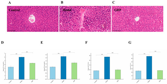 Effects of GRP on serum biochemical indices and histopathology. (A–C) Representative images of hematoxylin and eosin (H&E) staining of liver tissues. The images are shown at a 20× zoom level; the ratio was 100 μm. (D–G) The levels of TC, TG, ALT, and AST in serum were measured, and the results are expressed as the mean ± SD (n = 6–8). ** p < 0.01.