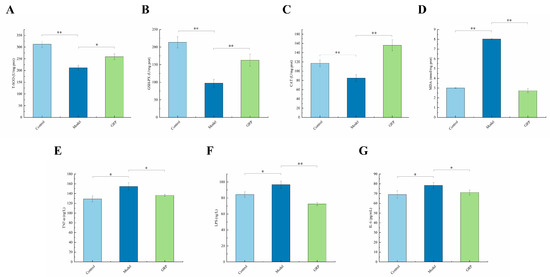The levels of T-SOD, GSH-Px, MDA, CAT, TNF-α, LPS, and IL-6 in the liver tissues of each group were measured (A–G), and the results are expressed as the mean ± SD (n = 6–8). * p < 0.05 and ** p < 0.01.
