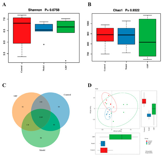 GRP altered gut microbial composition and diversity in alcohol-induced mice: (A) Shannon index; (B) Chao1 index; (C) Venn diagram; (D) PCA diagram.