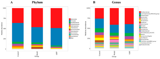 GRP altered the composition of the gut microbiota in alcohol-administered mice: (A) average relative abundance of each group at the gate level; (B) average relative abundance (n = 6) for each genus level.