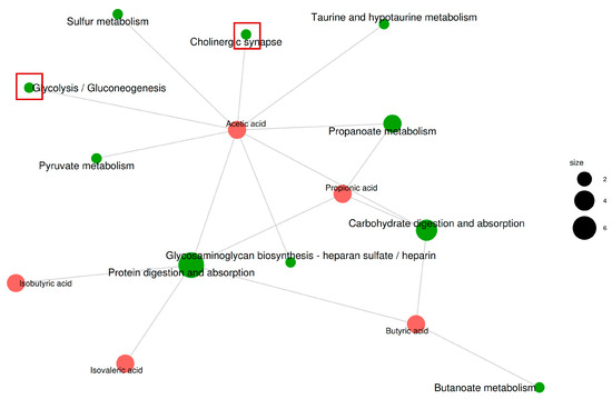 GRP improves the predictive pathways associated with ALD’s effect. Green dots represent metabolic pathways, and other dots represent metabolite molecules. The size of the metabolic pathway point indicates the number of metabolite molecules connected to it, where the higher the number, the larger the point, and the size of the metabolite molecular point indicates the log2(FC) value through the gradient change. The colors in the figure represent correlations, with green representing negative correlations and red representing positive correlations. The red boxes are the two main metabolic pathways described below.