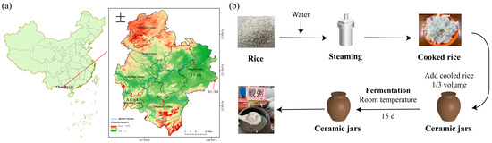 Sampling point distribution and production process of ZAC. (a) Distribution map of acid congee consumption along the Zuojiang River Basin. (b) Flowchart of traditional acid congee production. Map based on standard map GS (2020) 4619 downloaded from the Standard Map Service website of the Ministry of Natural Resources, without modification.