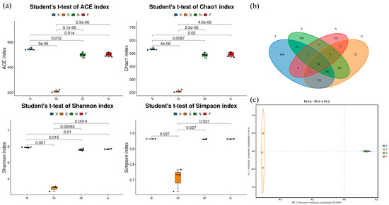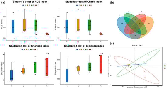 Alpha diversity of acid congee microbiota. (a) ACE, Chao1, Shannon, and Simpson indices of four groups of samples. (b) Veen graph of four groups of samples. (c) PCoA graph of four groups of samples. X: Xiashi, S: Suxu, N: Ningming, F: Fusui.