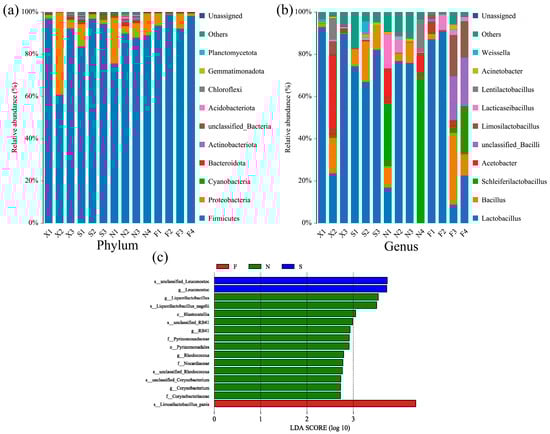 Bacterial flora composition and differential flora of acid congee. Histograms of top 10 relative abundance of bacteria phyla (a) and bacteria genera (b) in the acid congee samples, with the rest classified as “Others”. (c) Histogram of linear discriminant analysis (LDA) scores, where the length of the bars represents the magnitude of the influence of species with significant differences, plotted with a set LDA score ≥ 2.0. X: Xiashi, S: Suxu, N: Ningming, F: Fusui.