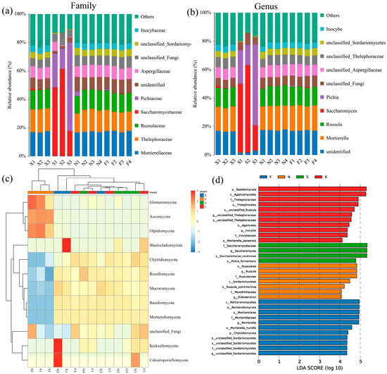 A total of 12 phyla were obtained from 14 acid congee samples through high-throughput sequencing. The content heatmap of each sample at the phylum level is shown in Figure 5c. Among them, Ascomycota was the dominant bacterial phylum in Group S, and its relative abundance was significantly higher than that of F, X, and N. In contrast, the relative abundance of Basidiomycota and Mortierellomycota in Groups F, X, and N was significantly higher than that in S. Figure 5a shows the composition of the bacterial community in the top 10 families of the acid congee sample, which were Mortierellaceae, Thelephoraceae, Russulaceae, Saccharomycetaceae, Pichiaceae, unidentified, Aspergillaceae, unclassified_Fungi, unclassified_Sordariomycetes, and Inocybaceae. The sequencing database was used for species annotation, and a total of 46 genera were obtained in four groups with a relative abundance greater than 0.1% at the genus level. The top 10 genera identified in the acid congee samples were unidentified, Mortierella, Russula, Saccharomyces, Pichia, unclassified_Fungi, unclassified_Aspergillaceae, unclassified_Thelephoraceae, unclassified_Sordariomycetes, and Inocybe (Figure 5b). Among them, the dominant genera in the S group were Saccharomyces (42.36%) and Pichia (31.66%), while the dominant genera in F, X, and N were Mortierella (17.23%) and Russula (13.34%).