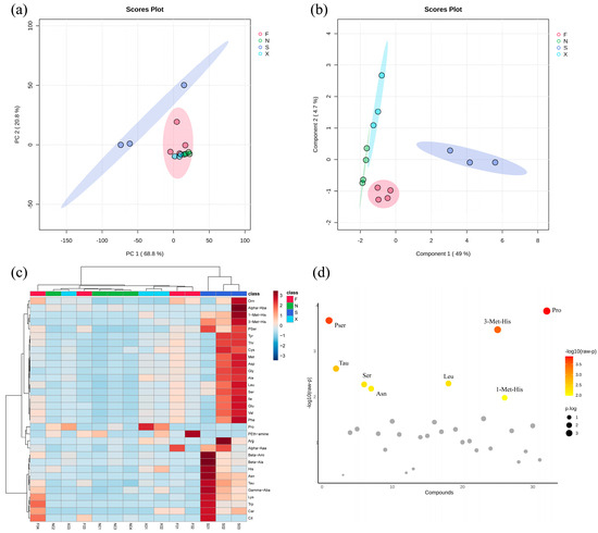 A total of 33 free amino acids were detected in all acid congee samples. The average content composition of each group is shown in Table 1. There were six kinds of flavor-producing amino acids, namely, aspartic acid, glutamic acid, glycine, alanine, tyrosine, and phenylalanine, accounting for 35.42% (F), 33.35% (N), 30.77% (S), and 39.59% (X) of the total amino acids. Alanine (11.07 ± 15.31 mg/100 g) and glutamic acid (11.62 ± 14.92 mg/100 g) dominated the flavor-producing amino acids. There were nine essential amino acids, namely, lysine, tryptophan, phenylalanine, methionine, threonine, isoleucine, leucine, valine, and histidine, accounting for 32.04% (F), 24.05% (N), 31.26% (S), and 25.83% (X) of the total amino acids. The highest in content was leucine, followed by lysine and valine. These three essential amino acids are relatively easy for the human body to absorb. Based on multivariate statistical analysis of the amino acid content composition in acid congee, PCA revealed that after dimensionality reduction, two principal components, PC1 (68.8%) and PC2 (20.8%), were obtained, in which F, N, and S were significantly separated (Figure 6a). Furthermore, on the basis of PLS-DA, the four groups clustered together within the group, but were distinguished between the groups, indicating that there were differences among the four groups (Figure 6b). The content clustering heatmap shows the samples in Group S in red, whereas those in Groups F, X, and N are lighter blue (Figure 6c). One-factor analysis of variance showed eight amino acids with significant differences among the four groups, namely, phosphoserine, taurine, serine, asparagine, leucine, 3-methylhistidine, 1-methylhistidine, and proline (Figure 6d). The eight significantly different amino acids among four groups were selected based on the FDR p value (Table S3). The differential distribution of the content of these eight amino acids in the four groups is shown in Figure S2. With the exception of proline, the content of the other seven differential abundant metabolites in the S group was significantly higher than that in the F, X, and N groups.