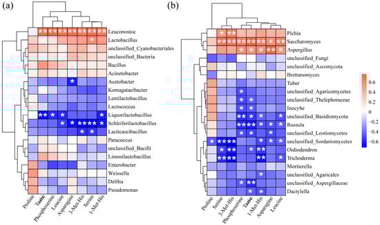 Spearman correlation analysis of acid congee bacterial groups and differential amino acids. (a) Spearman correlations between the top 20 bacterial genera and 8 differential amino acids. (b) Spearman correlations between the top 20 fungal genera and 8 differential amino acids. Red indicates positive correlation and blue indicates negative correlation. Significance level: * indicates p < 0.05, ** indicates p < 0.01.