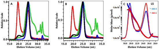 High-performance size-exclusion chromatography analysis of the Hamlin (DM-D4) (A) and Valencia (DM-D6) (B) varieties; superimposed calibration curve of Hamlin and Valencia (DM-D4, DM-D6) (C). In Figure 1A,B, HPSEC detectors were light scattering at 90 °C (-), differential pressure viscometer (-), refractive index (-), and ultraviolet absorption at 280 nm (-). In Figure 1C, HPSEC detectors were light scattering at 90 °C, (DM-D4) and HPSEC detectors were light scattering at 90 °C, DM-D6.