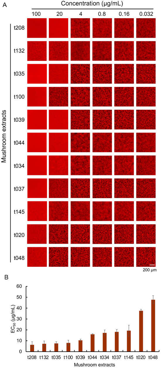 Fluorescence images and EC50 values demonstrating the inhibitory effects of mushroom extracts on Aβ aggregation. (A) Analysis of Aβ aggregation inhibitory activity of 11 mushroom extracts. Mixed solutions of 25 μM Aβ42 and mushroom extracts were added to 1536-well plates and imaged by fluorescence microscopy after incubation at 37 °C for 24 h. The captured images were cropped to 432 × 432 pixels. (B) Measurement of EC50 values of 11 mushroom extracts. Data are represented as mean ± SD (n = 4). Smaller EC50 values indicate higher inhibitory activity. EC50 values were calculated using Prism GraphPad software.