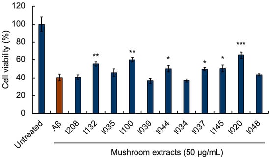 PC12 cell viability is a relevant indicator for determining Aβ aggregation []. The researchers state that NGF treatment leads to the differentiation of PC12 cells and the relative number of differentiated cells in each case has been quantified []. We tested the 11 mushroom extracts with Aβ inhibitory activity, using the MTT assay, to verify whether they could inhibit Aβ-induced neurotoxicity in NGF-differentiated PC12 cells (Figure 2). The PC12 cell viability of the mixture of 25 μM Aβ42 and 50 μg/mL t208 mushroom extract was 40.53%, indicating that cell viability was not restored. The t100 and t020 mushroom extracts significantly increased PC12 cell viability at 50 μg/mL, increasing it to 59.98% and 65.26%, respectively, indicating that they had the best inhibitory effect on Aβ-induced neurotoxicity in PC12 cells. In contrast, the t039 and t034 extracts at 50 μg/mL reduced cell viability by about 4% compared with the Aβ42 group. Some mushroom extracts presumably contain cytotoxic substances, and even if they have high Aβ aggregation inhibitory activity, cell viability may not necessarily be high. Therefore, in this study, which also considers functional food applications, we focused on mushroom extracts with high Aβ aggregation inhibitory activity and cell viability enhancing activity.