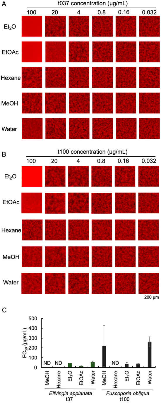 Fluorescence images and EC50 values of the inhibitory effect of extracts of 2 mushrooms with different solvents on Aβ aggregation. (A) Analysis of the inhibitory activity of t037 at different concentrations on Aβ aggregation in five extraction solvents. (B) Analysis of the inhibitory activity of t100 at different concentrations on Aβ aggregation in five extraction solvents. The fluorescence images were cropped to 432 × 432 pixels. (C) Measurement of EC50 values of t037 and t100 in five extraction solvents. Samples with SD values not less than 50% were considered as unable to calculate EC50 values and expressed as not determined (ND). Data are represented as the mean ± SD (n = 3).