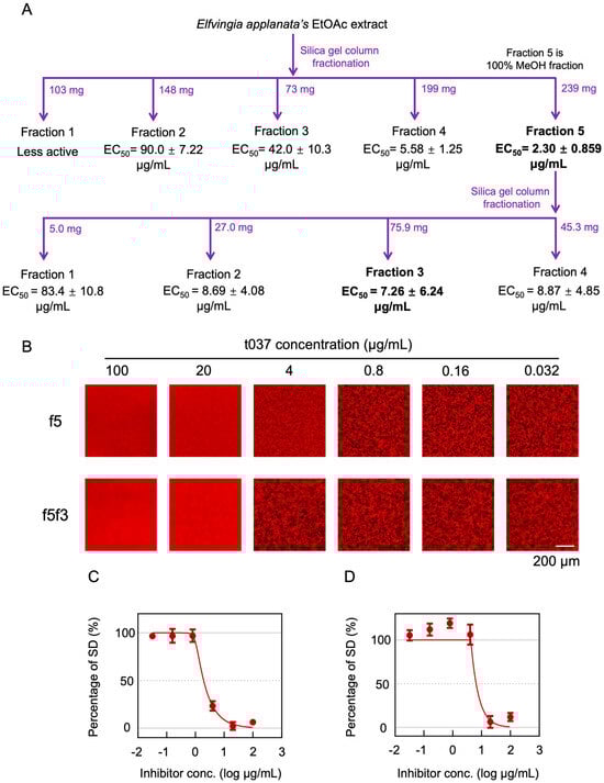 Evaluation of the inhibitory effects of active ingredients in the t037 EtOAc extract. (A) The t037 EtOAc extract was separated into five fractions (f1−f5) by silica gel column fractionation. f5 was further separated into four fractions (f5f1−f5f4) by same silica gel column fractionation. (B) Fluorescence imaging of the two fractions (f5 and f5f3) with high Aβ aggregation inhibitory activity. The fluorescence images were cropped to 432 × 432 pixels. (C) The inhibition curve of f5. (D) The inhibition curve of f5f3. The inhibition curves were drawn from the SD values, and EC50 was calculated using Prism GraphPad software.