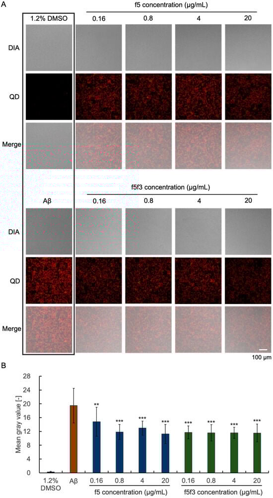 SH-SY5Y cells (EC94030304-F0), human neuroblastoma cells, were purchased from KAC (Kyoto, Japan). SH-SY5Y cells were added to a DMEM medium containing 10% FBS, 100 U/mL penicillin, and 100 μg/mL streptomycin, and the cells were cultured in a 5% CO2 incubator (MG-70C, TAITEC, Saitama, Japan) at 37 °C. SH-SY5Y cells were prepared to a concentration of 6.0 × 104 cells and seeded into 10 μg/mL fibronectin-coated 96-well plates (5866-096, Iwaki AGC Techno Glass Co., Ltd., Shizuoka, Japan) and incubated for 24 h. Then, the medium was removed, and the cells were treated with 25 μM Aβ containing QDAβ and various concentrations of f5 and f5f3 and incubated for 24 h. Washed with 1× PBS (100 μL per well) once, then added 1× PBS (100 μL per well). To each solution, 4% paraformaldehyde phosphate buffer solution (163-20145, FUJIFILM Wako Pure Chemical Corp., Osaka, Japan) was added. After incubation for 20 min, images were observed by an inverted fluorescence microscope. The mean gray value (representing Aβ aggregation) in five different areas (each area: 1608 × 1608 pixels) of each well was measured using ImageJ software version 1.53b.