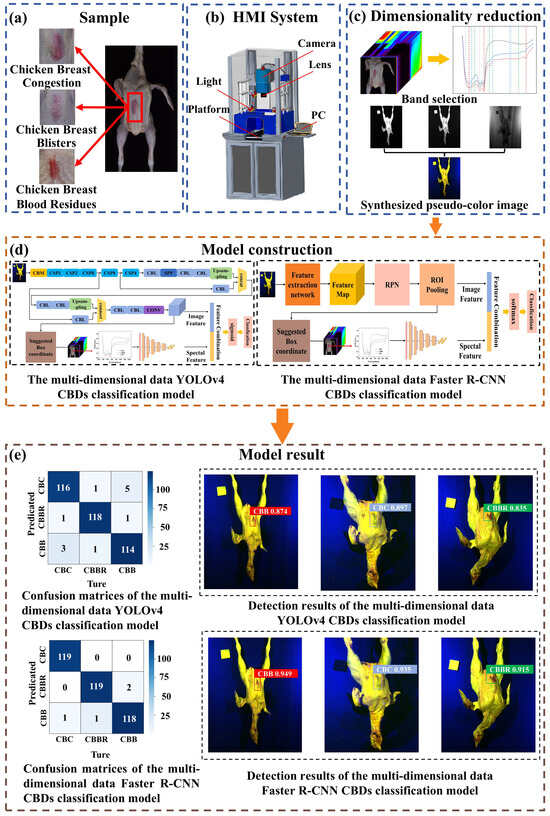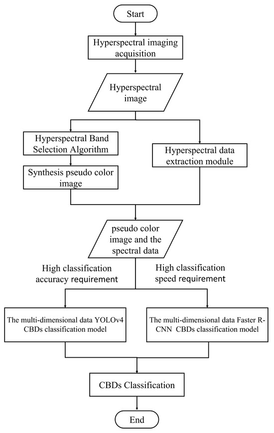 In summary, multidimensional data classification models based on hyperspectral data are capable of performing the classification tasks for CBDs. The main detection flow of the model is shown in Figure 14. However, different model architectures have different focuses in terms of classification: the multidimensional data Faster R-CNN localization and identification model exhibits higher classification and localization accuracy, while the multidimensional data YOLOv4 localization and identification model provides faster classification speed. In practical production, different models can be selected based on specific needs in terms of classifying CBDs. It should be emphasized that, as the classification accuracy of the model will be affected by the field environment and chicken species, when in a new detection environment, more hyperspectral images of chicken carcasses in the current environment need to be collected to correct and add training to the model in order to maintain the original classification accuracy.