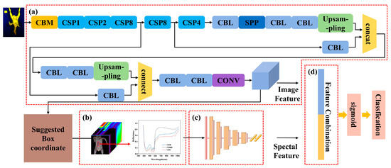 The structure of the multidimensional data YOLOv4 CBD classification model: (a) improved head part; (b) the spectral data extraction module; (c) the 1-D CNN CBD classification model for one-dimensional feature extraction; (d) the feature fusion layer.