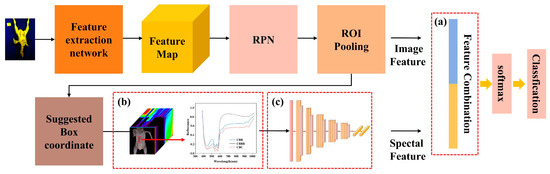 Faster R-CNN, like YOLOv4, relies on two-dimensional image features for classification. Faster R-CNN uses two-dimensional convolution, max pooling, and fully connected layers to achieve the feature extraction, localization, and identification of CBDs, respectively. Among these features, the Region Proposal Network (RPN) in Faster R-CNN has two decision branches: one is responsible for determining whether the generated anchors contain CBDs, and the other is responsible for obtaining coordinate adjustment parameters. At the end of the RPN, initial rough detection results are obtained. The CBD classification based on Faster R-CNN has the same limitations as the use of YOLOv4. Similarly, to improve the identification accuracy of defects and to compare the accuracy of these two models in multidimensional data identification, the spectral data extraction module (Figure 4a), the 1-D CNN CBD classification model for one-dimensional feature extraction (Figure 4b), and the feature fusion layer (Figure 4c) were also added to the structure of Faster R-CNN. The multidimensional data Faster R-CNN CBD classification mode, shown in Figure 4, was constructed.