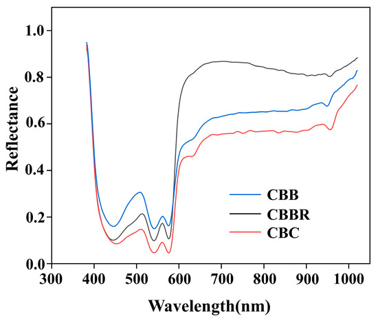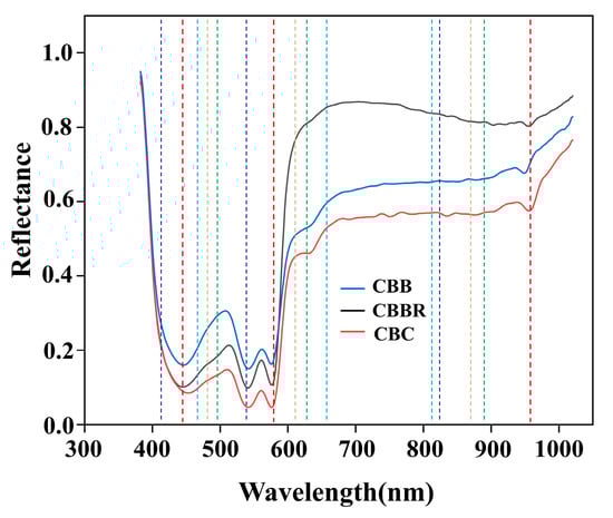 Due to the different moisture, protein, and other contents in various CBDs, their spectral performances also differ. As shown in Figure 5, by calculating the average spectral reflectance of breast defects (CBC, CBBs, and CBBRs) in each hyperspectral image, the average spectral curves of all CBDs were obtained. It can be seen that the three defect types have distinct absorption peaks in the 420–600 nm wavelength range and a smaller absorption trough in the 950–970 nm range. The wavelength ranges of 420–450 nm, 520–570 nm, and 570–600 nm represent proteins that correspond to the main hemoglobin components of the blood [29]. These values are consistent with the three defects being closely related to blood composition. Due to the different causes of defect formation, the number of red blood cells and the hemoglobin content of the above three blood-related defects are different. CBC results from internal bleeding due to a chest impact, CBB results from capillary rupture and bleeding due to prolonged friction, and CBBR is blood that was not completely rinsed off the surface after external bleeding. Therefore, the hemoglobin content decreases sequentially from CBC to CBBRs to CBBs. This is reflected in the spectral curves as a sequential decrease in absorption intensity in the protein absorption bands of CBC, CBBs, and CBBRs. The band near 960 nm is related to water absorption [30]. CBBs contain tissue fluid, and CBC contains plasma, and both of these are primarily composed of water. CBBRs, having been air-dried, have the least amount of moisture compared to the other two defects. This is reflected in the spectral curves near 960 nm, where the spectral reflectance decreases sequentially from CBC to CBBs to CBBRs. The trends and differences in the spectral curves indicate that it is feasible to classify CBC, CBBs, and CBBRs using hyperspectral data.