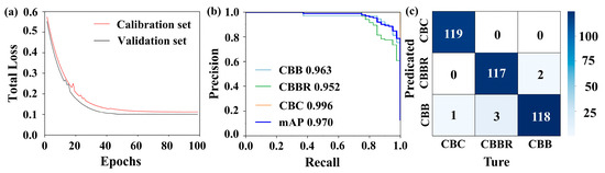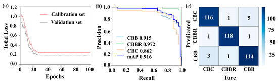 Detection results of the multidimensional data Faster R-CNN CBD classification model: (a) loss curves; (b) PR curves; (c) confusion matrices.