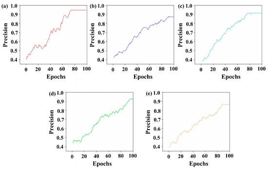 The variation in the defect recognition accuracy of the 5 band combinations selected by the Improved Firefly Band Selection Algorithm: (a–e) are the variations in defect identification accuracy for each band combination. The corresponding band combinations are 430 nm, 576 nm, and 962 nm; 410 nm, 525 nm, and 815 nm; 457 nm, 662 nm, and 809 nm; 498 nm, 621 nm, and 895 nm; and 489 nm, 605 nm, and 872 nm, respectively.
