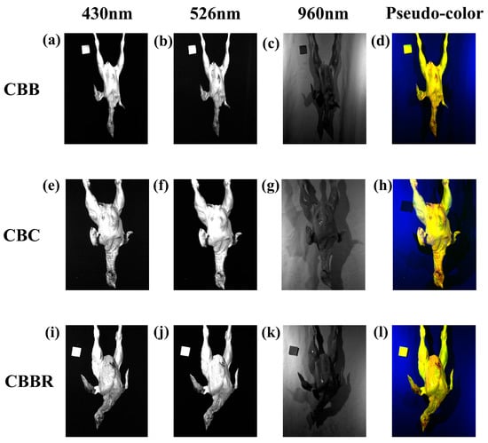 Pseudo-color images synthesized using grayscale images. The grayscale images of CBBs (a–c), CBC (e–g), and CBBRs (i–k) at 430 nm, 576 nm, and 962 nm are synthesized into pseudo-color images (d,h,l).