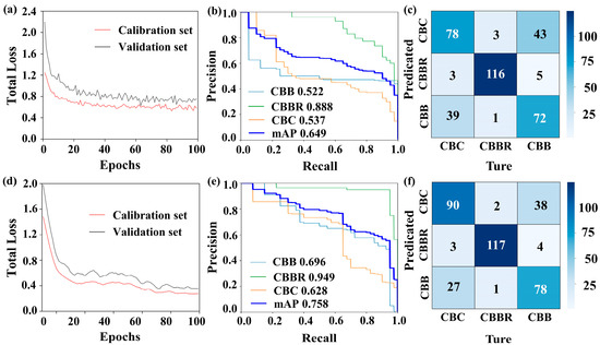 The specific training results of the CBD classification model based on pseudo-color images: (a–c) are the loss curves, PR curves, and confusion matrices of the YOLOv4 CBD classification model; (d–f) are the loss curves, PR curves, and confusion matrices of the Faster R-CNN CBD classification model.