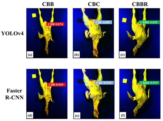Randomly selected detection results of the model: (a–c) and (d–f) are the random detection results of the YOLOv4 CBD classification model and the Faster R-CNN CBD classification model, respectively, for chicken carcasses with CBB, CBC, and CBBR defects.