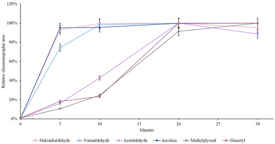 The US-DLLME-GC-MS method was previously developed in our lab to determine MDA and ACRL in beverages [22]. Herein, we studied the method’s applicability to four additional carbonyl compounds (FCHO, ACE, MGO, and DMGO) in adult formula. We used a standard adult formula as a blank sample to ensure the method’s suitability for the simultaneous extraction of these six analytes from the adult formula. First, a kinetic study was performed in triplicate to assess the formation of carbonyl-DNPH derivatives (Figure 1). MDA and ACRL reached equilibrium after 5 min of ultrasound treatment, FCHO after 10 min, while ACE, MGO, and DMGO required 20 min.