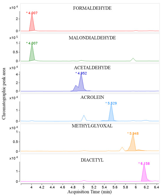 Unless otherwise specified, all chemicals used were high purity (>98%). Acetaldehyde (ACE, CAS 75-07-0), Acetonitrile (ACN, CAS 75-05-8), Chloroform (CHCl3, 35%, CAS 67-66-3), Deuterated Acetaldehyde (ACEd4, CAS 1632-89-9), Deuterated Acetone (ACOd6, CAS 666-52-4), Diacetyl (DA, CAS 431-03-8), 2,4-Dinitrophenylhydrazine (DNPH, CAS 119-26-6), Formaldehyde (FCHO, CAS 50-00-0), Malondialdehyde (MDA, CAS 643-12-9), and Methylglyoxal (MGO, 40% CAS 78-98-8) were all supplied by Merck (Darmstadt, Germany). Acrolein (ACRL, CAS 107-02-8) was purchased from LGC Standards (London, UK).