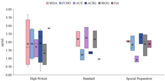 All target analytes were detected, although not always at quantifiable levels; therefore, a box-and-whisker chart showing only quantifiable samples is presented for clearer comparison (Figure 3). In high-protein adult formulas, 80% of samples were quantifiable for MDA (0.53–2.89 µg/mL), FCHO (0.94–2.86 µg/mL), and ACRL (0.24–2.80 µg/mL). Additionally, 60% of samples were quantifiable for ACE (1.8–2.16 µg/mL) and MGO (0.61–1.89 µg/mL), with one sample quantifiable for DA at 2.94 µg/mL. In standard adult formulas, 50% of samples were quantifiable for MDA (1.73–2.65 µg/mL), FCHO (0.9–1.56 µg/mL), ACE (1.63–2.91 µg/mL), ACRL (1.27–1.43 µg/mL), and MGO (1.65–2.69 µg/mL), with only one sample quantifiable for DA at 0.97 µg/mL. For specialized formulations, only one enteral powder sample, intended for oral or tube administration, was quantifiable for MDA. All analytes in this sample type were quantifiable, with levels ranging from 2.0–2.09 µg/mL for MDA, 1.48–2.39 µg/mL for FCHO, 0.79–1.16 µg/mL for ACE, 1.89–2.49 µg/mL for ACRL, 1.16–2.46 µg/mL for MGO, and 1.67–2.11 µg/mL for DA.