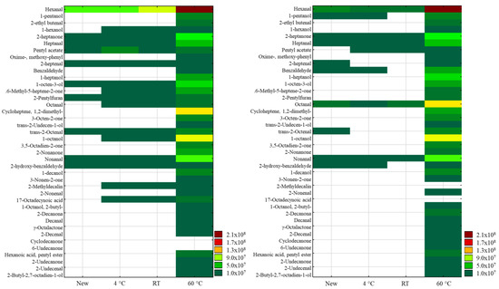 Hexanal appears stable at 4 °C, with a slight increase noted in one sample stored at room temperature. However, both samples showed a significant increase in hexanal levels after 30 days at 60 °C. The other compounds in the fresh samples seem stable at both 4 °C and room temperature. In contrast, most compounds exhibited some increase when stored at 60 °C, except for nonanal and 2-hydroxybenzaldehyde, which remained stable at all temperatures. Moreover, compounds such as 1-hexanol, octanal, 1-octanol, 2-methyldecaline, and 17-octadecenoic acid appeared after 30 days of storage at all studied temperatures. Other compounds, including 1-pentanol, 1-heptanol, 2-nonanone, 1-decanol, 1-octanol, 2-decanone, decanal, γ-octalactone, 2-decenal, cyclodecanone, 6-undecanone, hexanoic acid pentyl ester, 2-undecanone, 2-undecenal, and 2-butyl-2,7-octadien-1-ol, were only present after 30 days of storage at 60 °C.