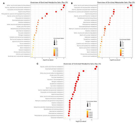 Metabolic pathway analysis of T. molitor samples. Over-Representation Analysis of CTRL (A) and TRT (B) metabolic pathways. Quantitative Enrichment Analysis to compare CTRL and TRT groups (C).