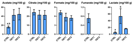 The analysis of the effect on organic acids of T. molitor larvae revealed significant differences among the groups, except for citrate (Figure 2). In general, all replicates for treatment presented a variable trend for the detected organic acids. Specifically, acetate and formate were comparable in TRT1 and TRT2 and differed from the CTRL group, which showed lower content of acetate. In contrast, the formate concentration was higher in the larvae of the CTRL group than in the treatment groups. The highest level of lactate was registered in TRT1.