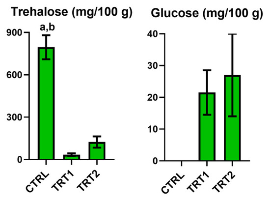 Trehalose was variable within each replicate for the group; however, the CTRL showed higher concentration with significant differences than the TRT1 (p = 0.0002). In contrast, glucose was absent in the CTRL, with similar levels between TRT1 and TRT2 (Figure 3).