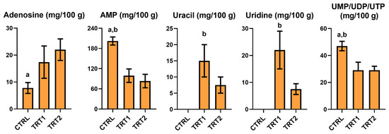 The qualitative and quantitative profiles of nitrogenous bases and their derivatives exhibited variability in each sample analyzed across all groups (8 replicates per group) (Figure 4). AMP was higher in CTRL compared to TRT groups. A similar trend was reported for UMP/UDP/UTP, observing higher values in the CTRL group compared to TRT1 and TRT2. Uracil was detected only in the insect reared on chestnut shell with lower values on TRT1 than TRT2. TRT2 showed the numerically higher value of adenosine with significant differences from the CTRL (p = 0.0058). TRT1 and TRT2 highlighted levels of uridine, which was absent in the CTRL group.