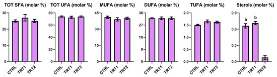 The relative content of lipidic fraction exhibited no variation across the samples from different groups (Figure 5), underlying that chestnut shell implementation did not affect the lipid metabolism of T. molitor. The only significative difference was observed for sterols in the TRT2 group, with a four-time decrease in the relative content.