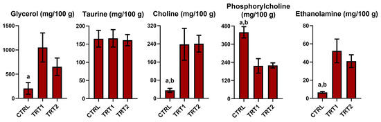 Regarding other compounds detected in T. molitor, ethanolamine, choline, and glycerol increase in TRT1 and TRT2 with significant differences compared to CTRL, Figure 6. Moreover, TRT1 was particularly rich in glycerol, with values significantly different from the other groups.