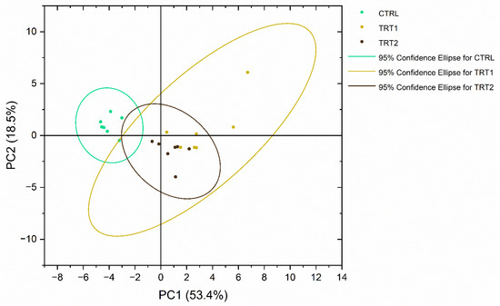 Principal component analysis (PCA) of 1H NMR of metabolites profiles acquired on CTRL (wheat bran), TRT1 (wheat bran and 12.5% of chestnut shell), and TRT2 (wheat bran and 25% of chestnut shell) larvae groups.