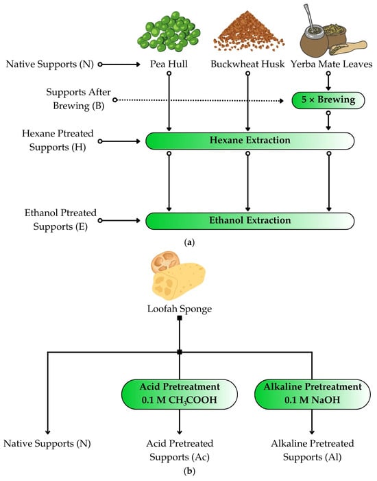 The lignocellulosic carriers, i.e., pea hulls, buckwheat husks, and yerba mate leaves were prepared by weighing 10 g of each material and grinding them in a coffee grinder (Esperanza EDC Poterek Sp. J., Ożarów Mazowiecki, Poland). The crushed materials were then subjected to extraction in a Soxhlet apparatus. For pea hulls and buckwheat husks, the materials were divided into three groups: native carriers without extraction (N), carriers extracted with hexane (H), and carriers extracted with hexane and then with ethanol (HE). As for yerba mate, due to its high content of active substances, it was divided into four groups: native carriers without brewing or extraction (N), carriers brewed five times (B), brewed carriers extracted with hexane (BH), and brewed carriers extracted with hexane and ethanol (BHE) (Figure 1a). Yerba mate was brewed by adding boiling water to the dried material, covering it with a vessel and allowing it to cool. The water was then drained, and the brewing process was repeated another four times. After brewing, the material was dried and ground in a coffee grinder.