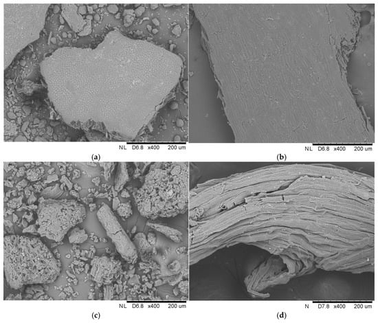 The analysis revealed large particles with a smooth surface and no visible cavities in the pea hull and buckwheat husk. In contrast, the analysis of yerba mate clearly showed smaller and less organized fiber particles. Additionally, fragmented pieces of the carrier, with densely arranged cavities and characteristic jaggedness, were observed. Unlike the abovementioned materials, the loofah sponge was characterized by its porous and irregular structure, which is evident in the SEM image. The rough surface has distinct fibrous cords with visible grooves and microcracks. In addition, the fiber surface has bright, similar-sized spots, which, according to Guo et al. [], were pectin and wax impurities. The network of fibers arranged in a multidirectional arrangement creates an elastic mesh with exceptional properties.