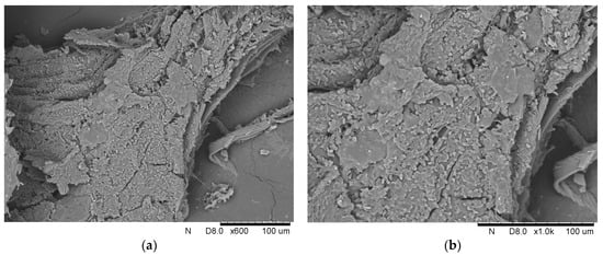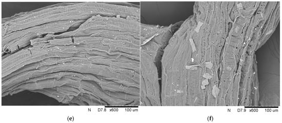 Scanning electron microphotographs of (a) pea hull, (b) buckwheat husk, (c) yerba mate leaves, and (d) loofah sponge at 400× magnification, and (e) and (f) loofah sponge at 600× magnification.