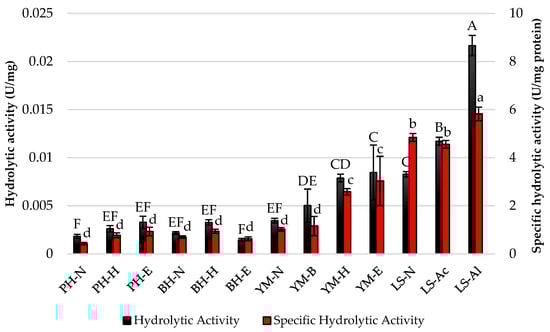Hydrolytic and specific hydrolytic activities of Sustine® 121 immobilized on different lignocellulosic materials. Error bars represent the standard deviation (SD) of three independent measurements. The values with the same uppercase (A–F) or lowercase letters (a–d) did not differ significantly (α = 0.05). Abbreviations: PH—pea hull, BH—buckwheat husk, YM—yerba mate, LS—loofah sponge, N—native support, B—brewing, H—hexane pretreatment, E—hexane and ethanol pretreatment, Ac—acid pretreatment, Al—alkaline pretreatment.