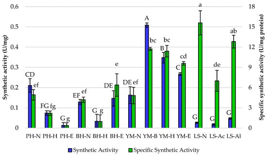 Synthetic and specific synthetic activities of Sustine® 121 immobilized on different lignocellulosic materials. Error bars represent the standard deviation (SD) of three independent measurements. The values with the same uppercase (A–G) or lowercase letters (a–g) did not differ significantly (α = 0.05). Abbreviations: PH—pea hull, BH—buckwheat husk, YM—yerba mate, LS—loofah sponge, N—native support, B—brewing, H—hexane pretreatment, E—hexane and ethanol pretreatment, Ac—acid pretreatment, Al—alkaline pretreatment.