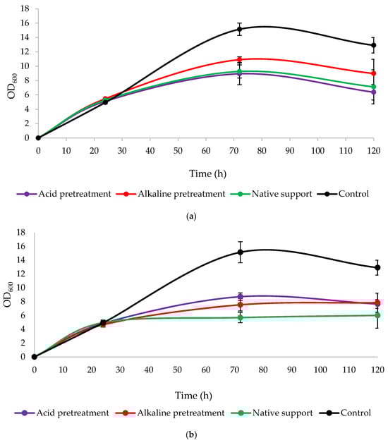 Changes in the optical density (Figure 6) acknowledged yeast growth in the presence of a loofah sponge. The control cultures (without LS in the medium) in both variants had the highest OD600 values. Then, significant growth was observed across all variants, particularly in the alkaline pretreatment of LS and its addition at the beginning of the culture, reaching a peak of 10.905 at 72 h. The prolonging of the cultures resulted in a decline in OD600 in most cultures or their values remained constant. The lower OD600 values using the sponge relative to the control appear to confirm that this lignocellulosic material is an outstanding carrier for the immobilization of enzymes and whole microbial cells.