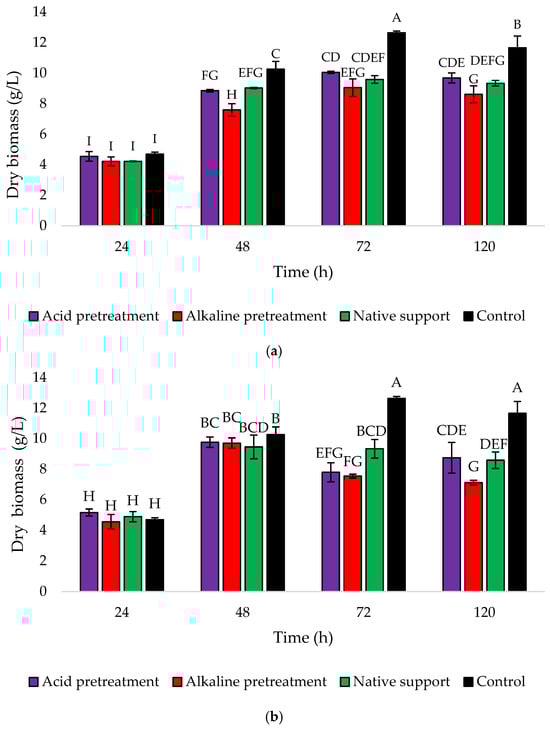 Changes in the yeast dry biomass (g/L) during 120 h culture of Y. lipolytica KKP 379 when: (a) 1 g of loofah sponge was added at the beginning of culture and (b) 1 g of loofah sponge was added after 48 h of culture. Error bars represent the standard deviation (SD) of three independent measurements. The values with the same uppercase letters (A–I) did not differ significantly (α = 0.05).